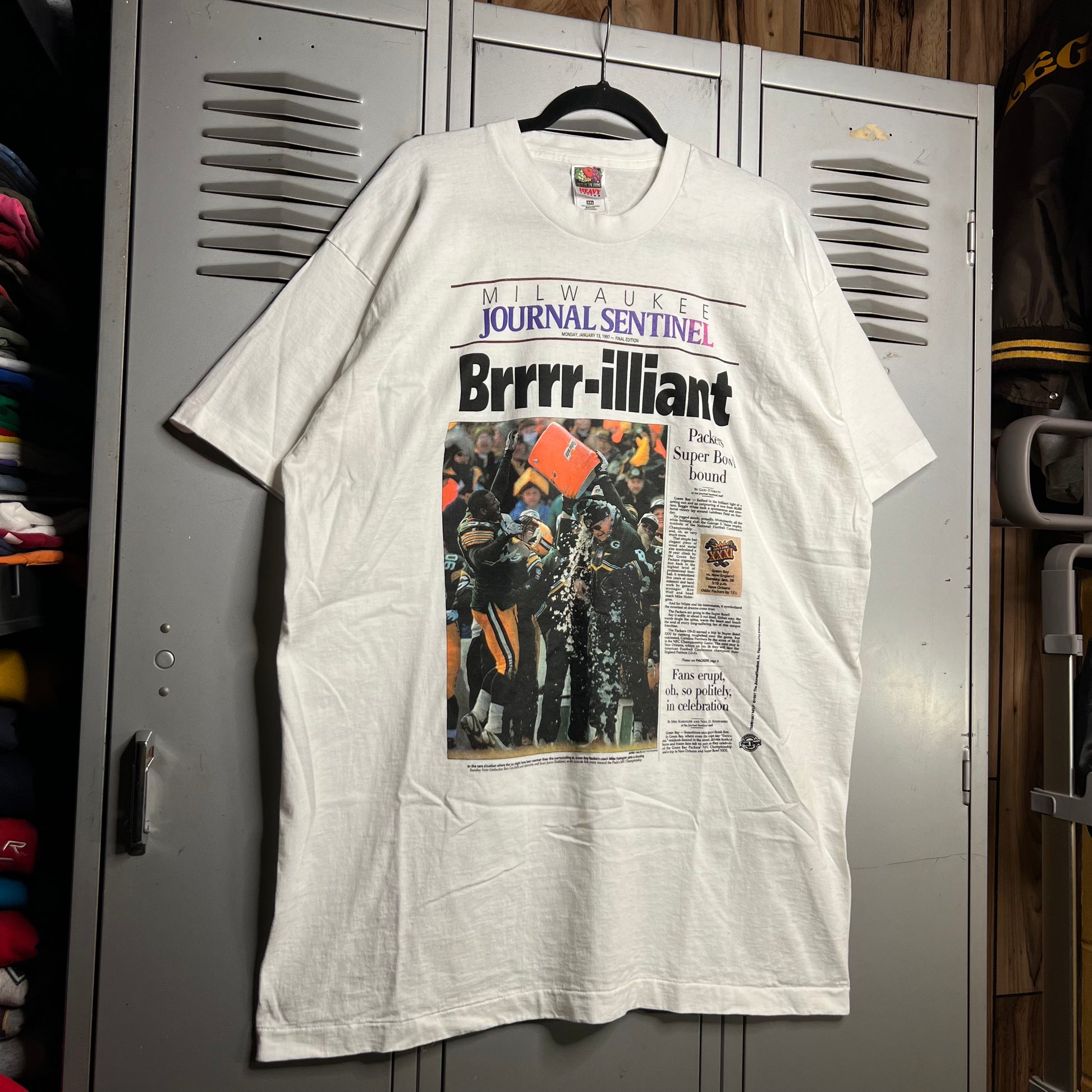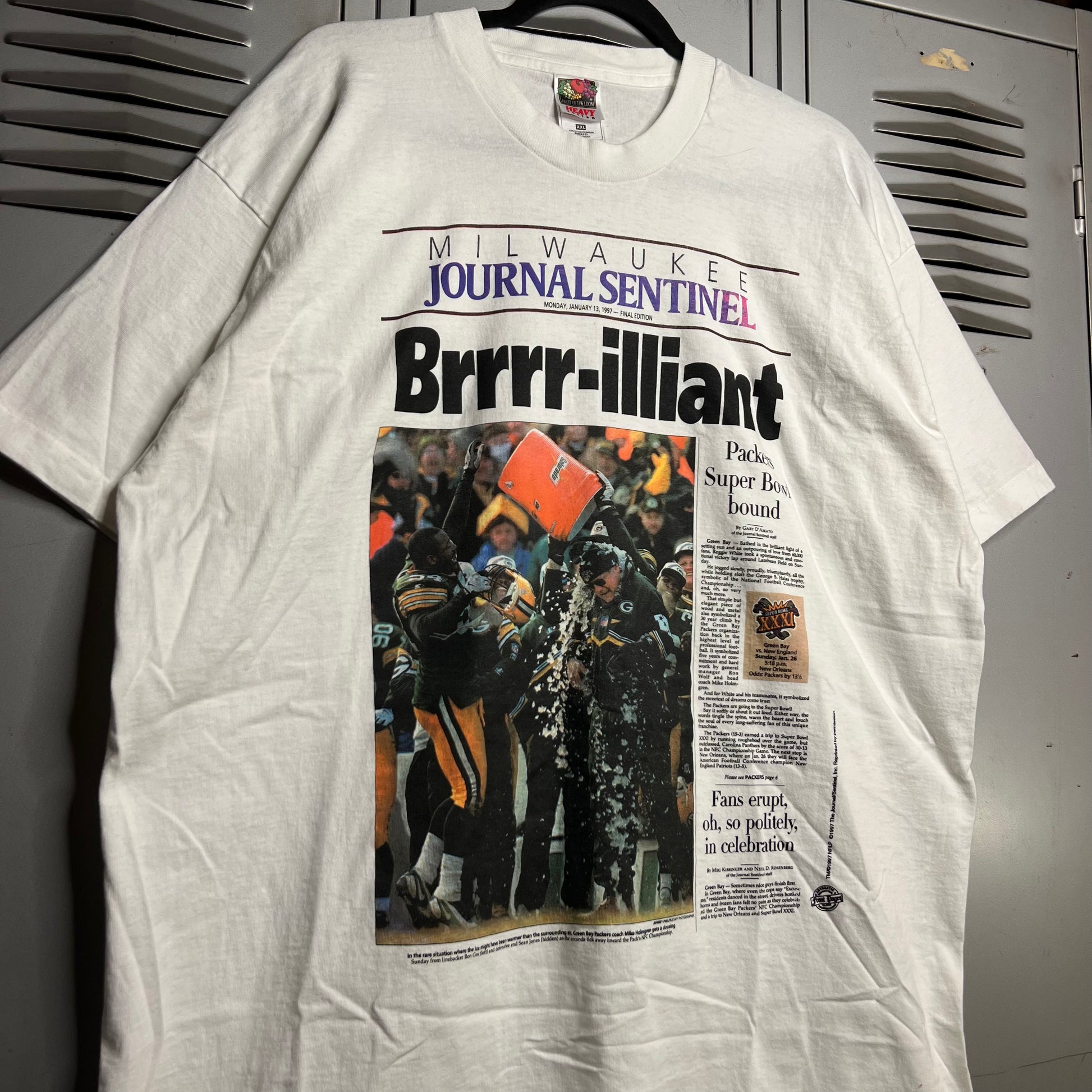 Vintage 1990s Green Bay Packers Super Bowl Bound x Milwaukee Journal Sentinel Brrr-illiant Single Stitch Fruit of the Loom T-Shirt