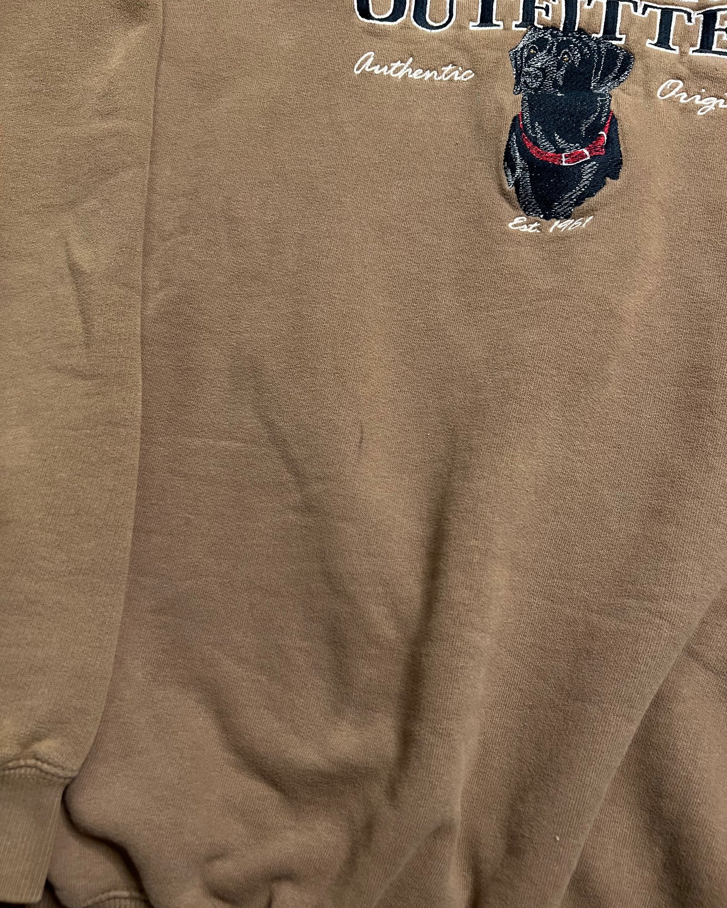 A simple crewneck with a great color and a black lab embroidered on the chest, in great condition with a faint black stain we pictured with a really soft feel to the fabric.